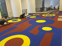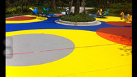 4、EPDM 面層涂布: 將單組份環(huán)保膠水及EPDM環(huán)保膠粒材料按比例攪拌混合均勻后,按設(shè)計圖案(顏色)及厚度鋪在地面上,用齒狀耙鏝涂,以控制用量和厚度找平壓實;